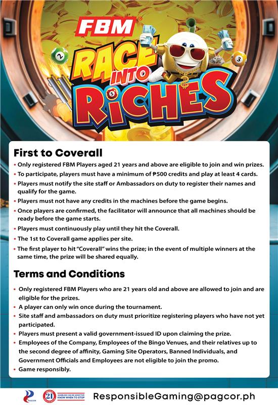 Every participating bingo hall will conduct a draw to determine the lucky prize winner each promo time. For complete details and the official mechanics of the FBM Race Into Riches initiative, see the images and guidelines shared below: